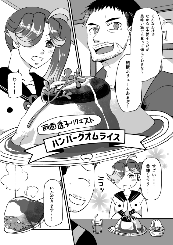 この全面にだされたオムライスはコマ枠線替わり(上と下の切り分け)であり、斜めになっているのはタマおじさんがそのまま手で持ってほいよ!と渡している描写を表現しています。
