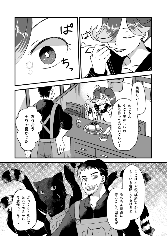 ぱくって食べる描写は絶対いれたいよね!そしてここが喫茶店及び食堂であることを説明するために内装を1コマだけでもいいから描いてます。