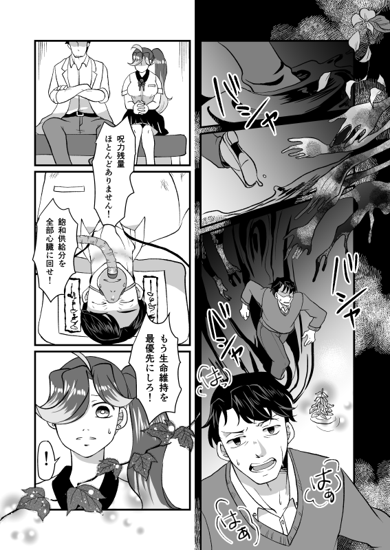 枠外を黒で塗った右側を黄泉での出来事、白の左側を現世の出来事として同時進行させています。それでいてどこをどう読んでも話としてつながる(支離滅裂にならないように)工夫しました。あとは1P左側、透子が蔦に気づいたようにこう、途中から目線を下にしましたね。最初はまっすぐ見てたんですよ。でもそれだとスタッフの声に驚いてる、ようにも見えてしまうので。